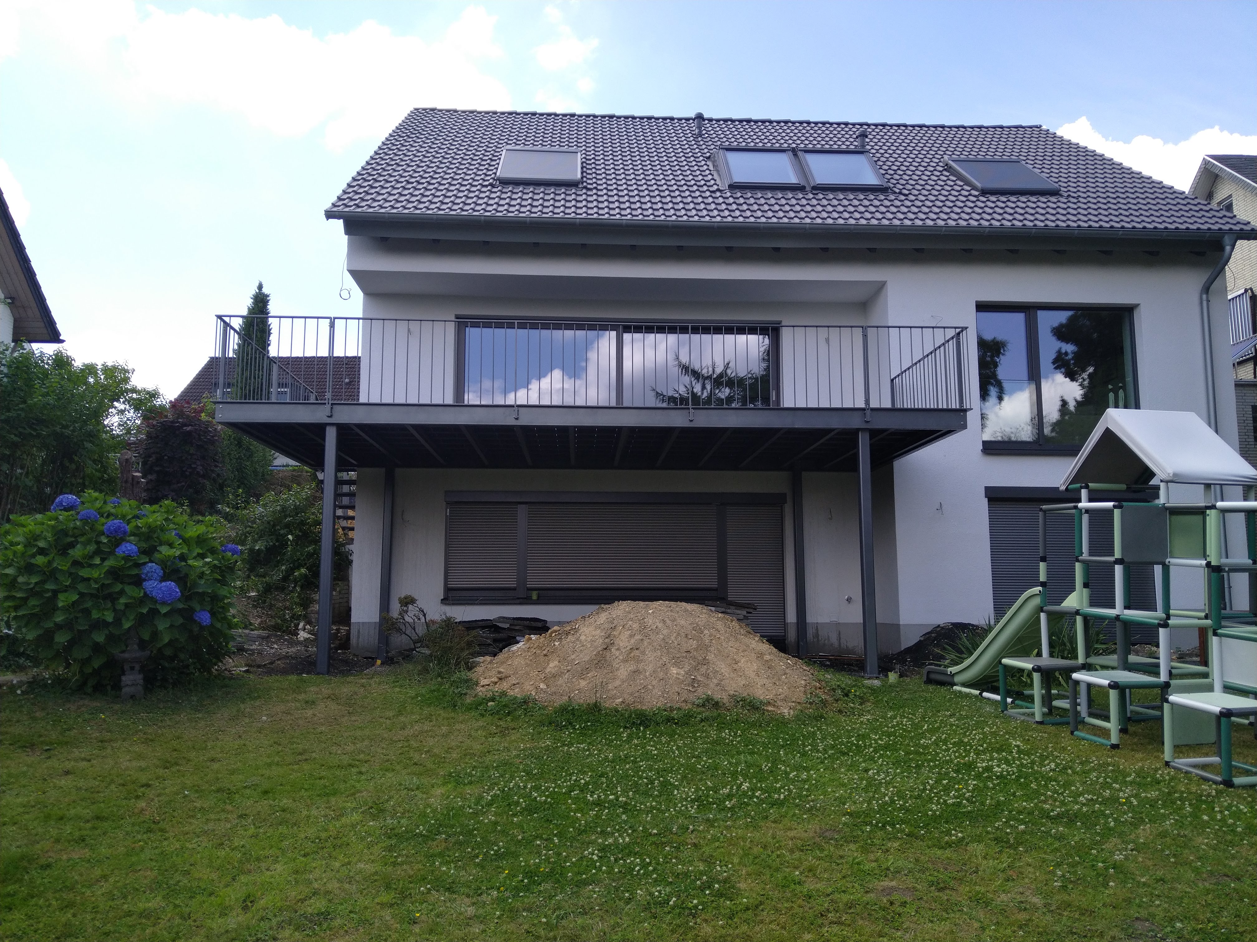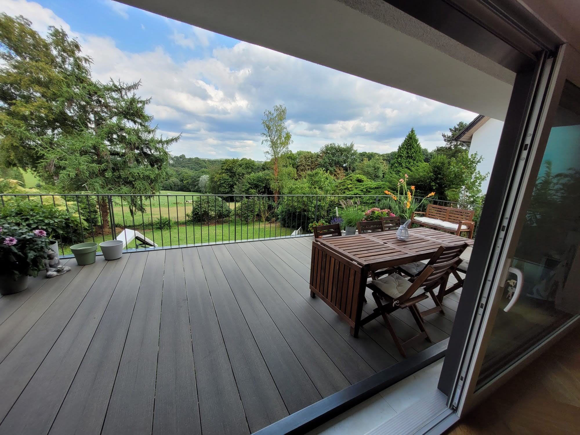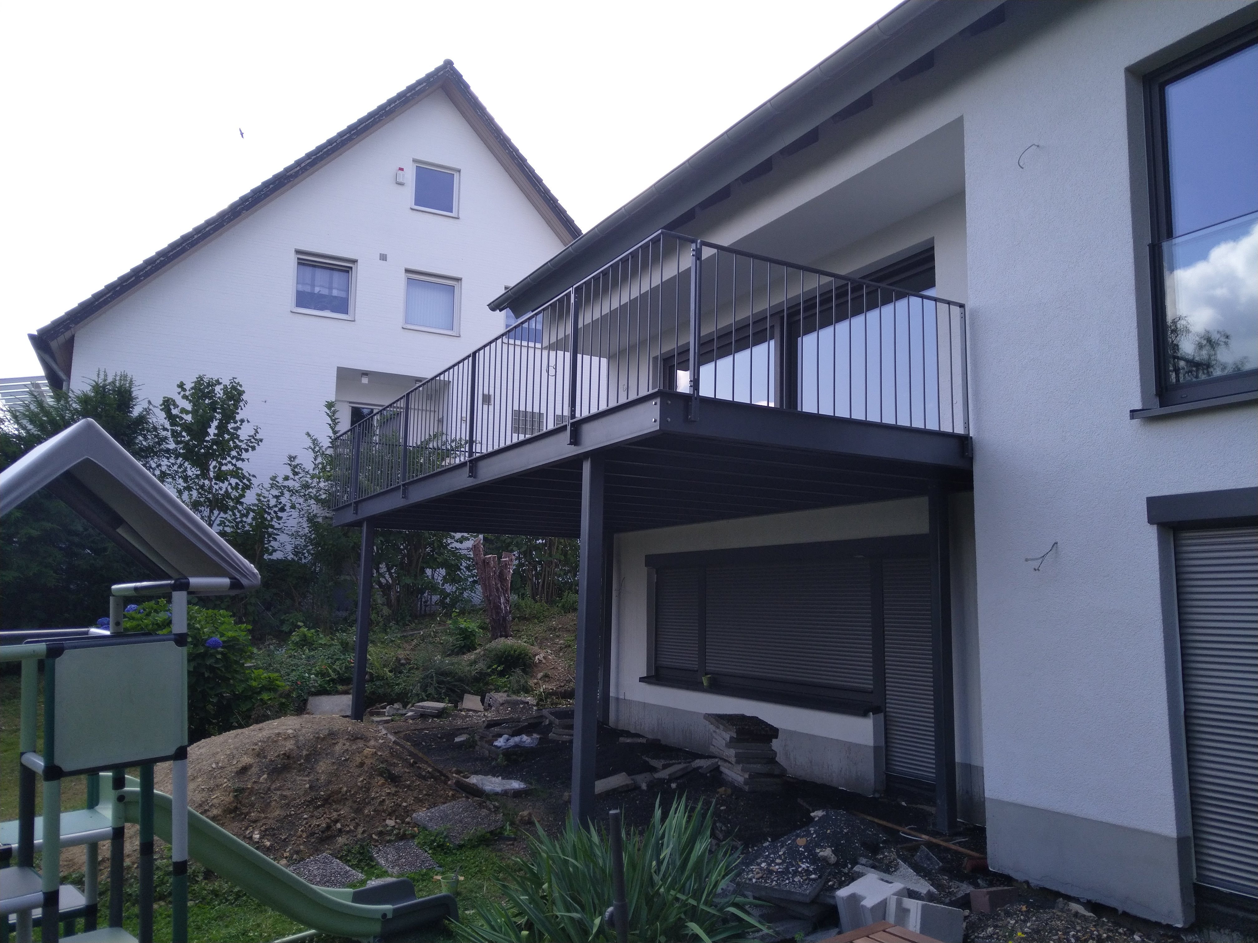 Eine Aufgeständerte Terrasse mit WPC Bodenbelag. Diese Terrasse wurde Verzinkt und anschließend in DB703 Pulverbeschichtet